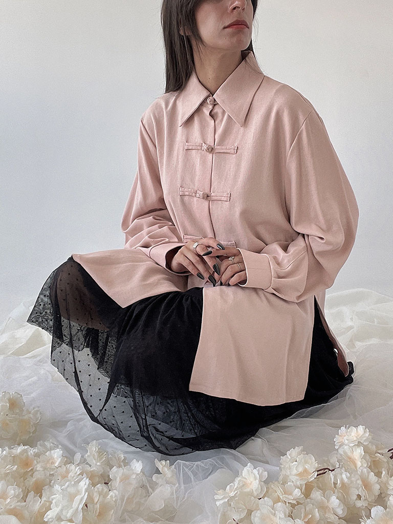 Cuello camisero, cortes laterales y aplicación de botón chino de tela hecho a mano.